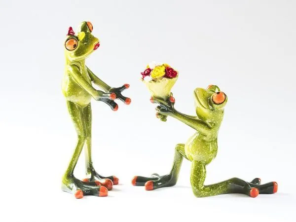Beeldje van een Oetel die bloemen geeft aan zijn durske. De kikkers zijn gemaakt van kunststeen. Leuk om cadeau te geven of natuurlijk zelf te houden.