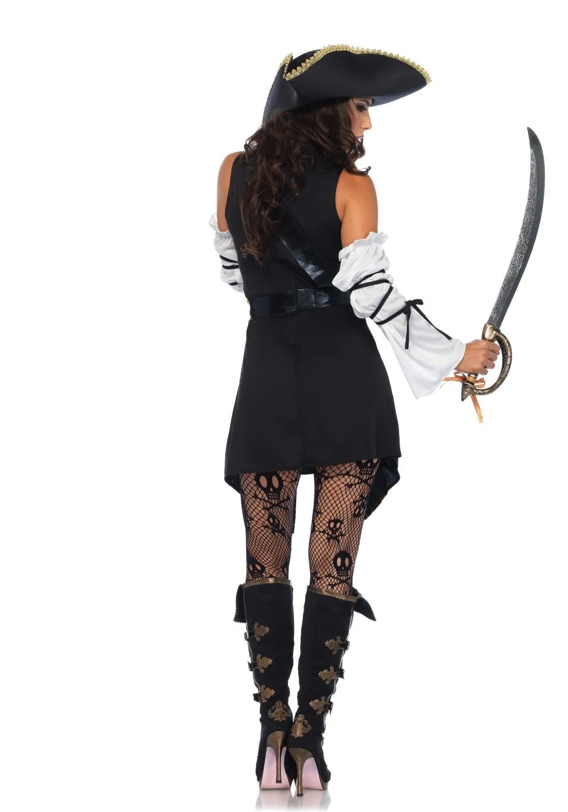 Black Sea Buccaneer is een prachtige piratenjurk. Het kostuum is zwart met gouden details. Deze piratenoutfit bestaat uit een jurk met gouden brokaat details, een crossbody riem en een piratenhoed. De jurk heeft witte mouwen met een wikkelaccent.
