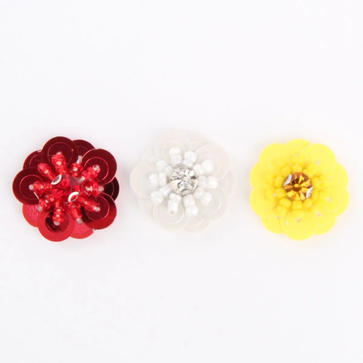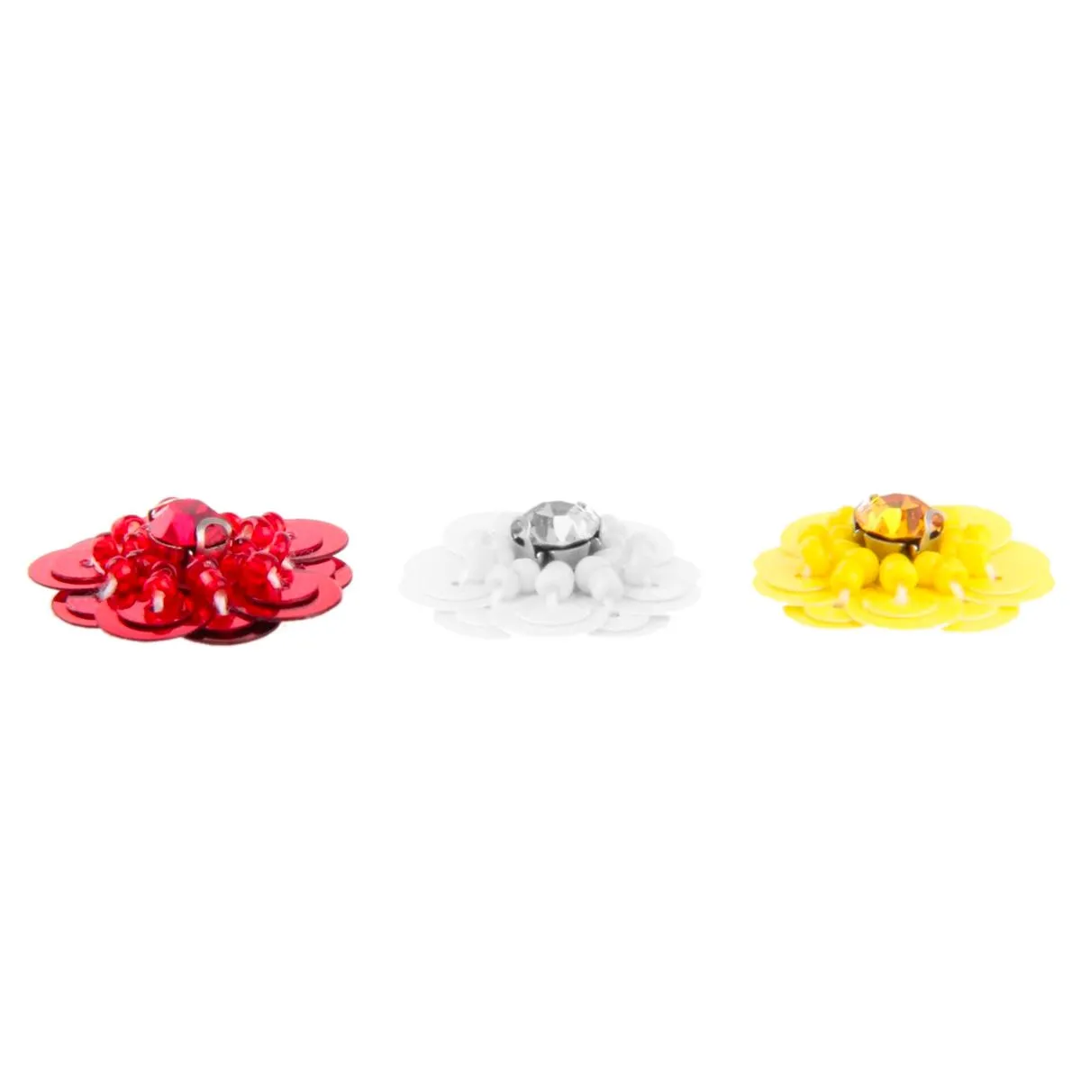 Rood wit gele pailetten bloemen om je Oeteldonkse outfit mee te versieren. Je kunt de bloemen lijmen of stikken. Set van 3 op een kaartje, 2,5 cm doorsnede.