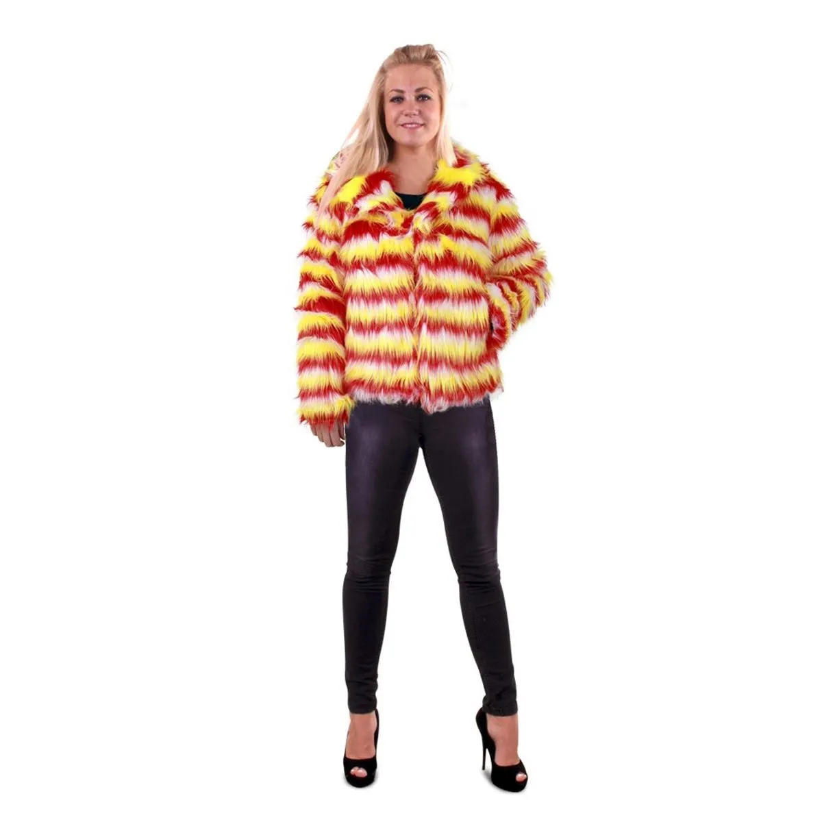 Leuk kort bontjasje met lange haren in de Oeteldonk kleuren rood-wit-geel.