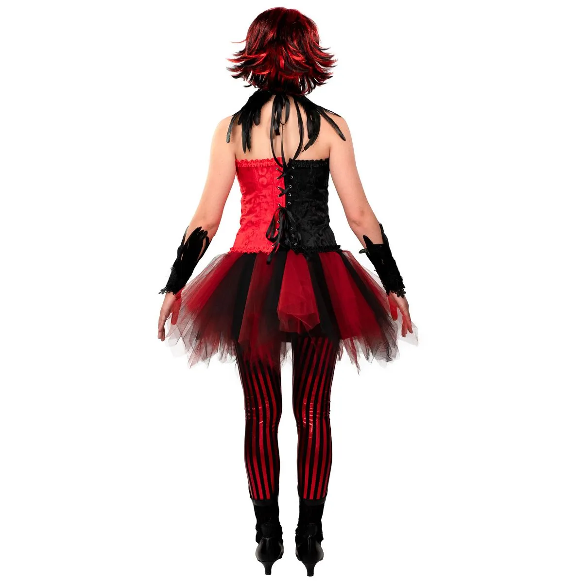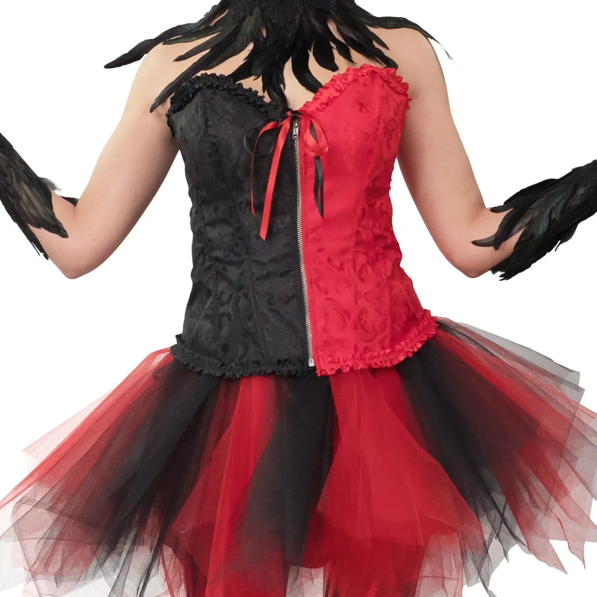 Sexy rood-zwart corset in een satijn-look met ruches. Aan de voorzijde een rits, aan de achterzijde strik sluiting. Met rood-zwarte lintjes.