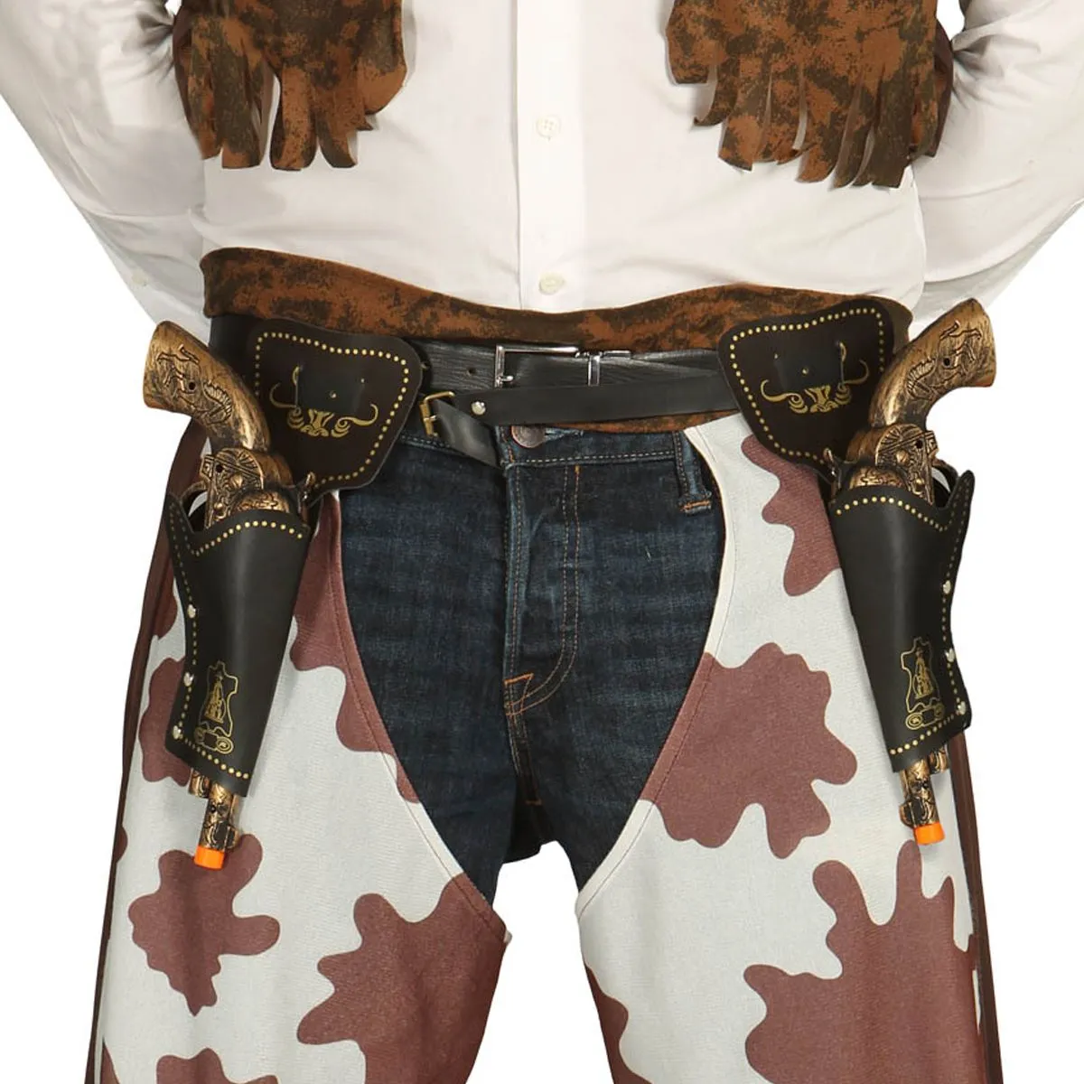 Dubbele imitatie lederen holsters met geweren.