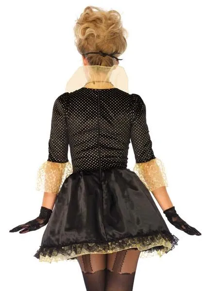 Dit fantasie gemaskerd kostuum bestaat uit een jurk met brocante effecten, hoge kraag en kanten details en bijpassend masker.