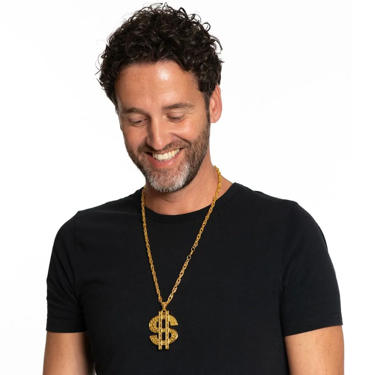 Stoere gouden ketting met een hanger in de vorm van een dollarteken. Super geschikt voor heel veel outfits. Combineer ‘m bijvoorbeeld met een van onze pimp kostuums.