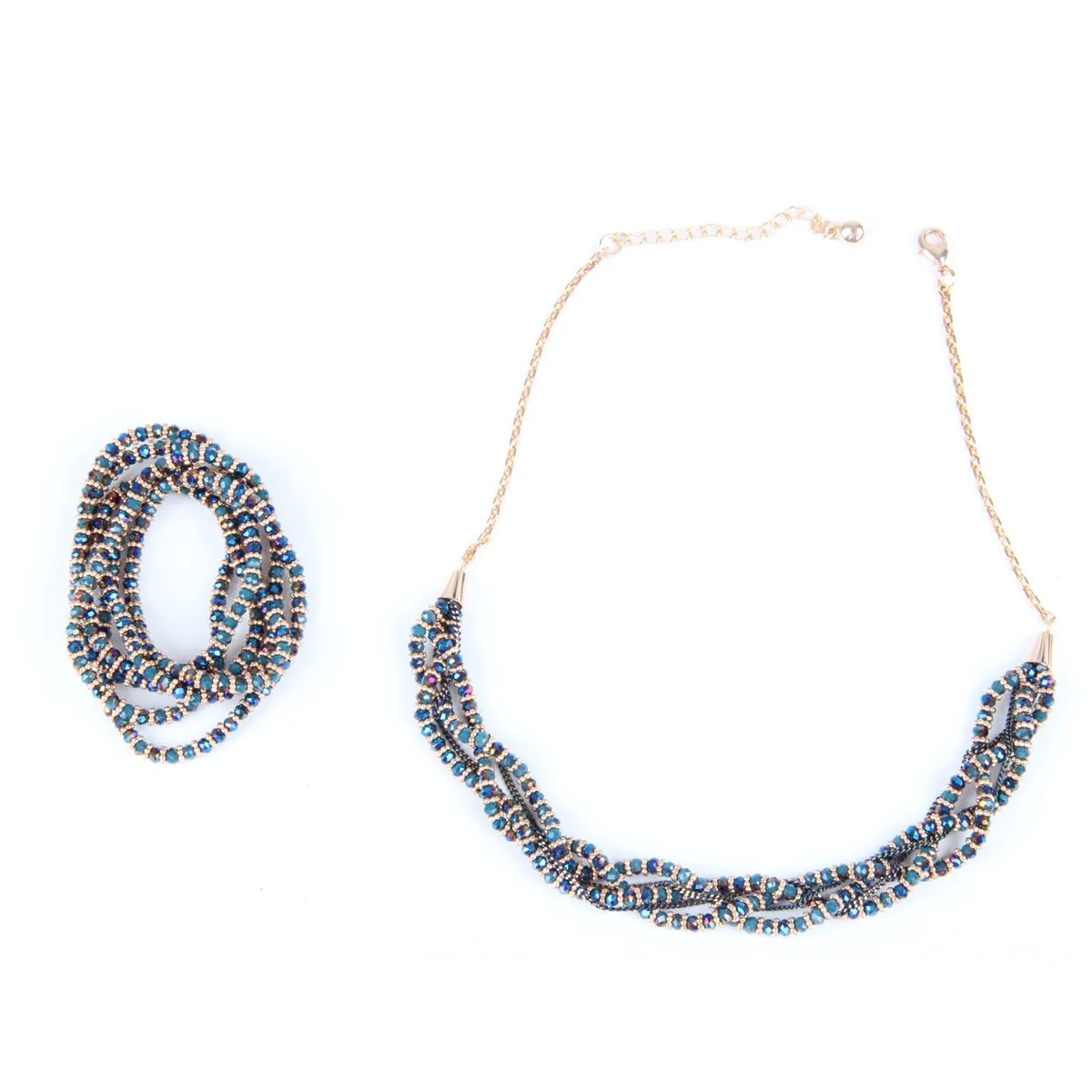 Gedraaide gouden ketting met kleine blauwe kraaltjes.