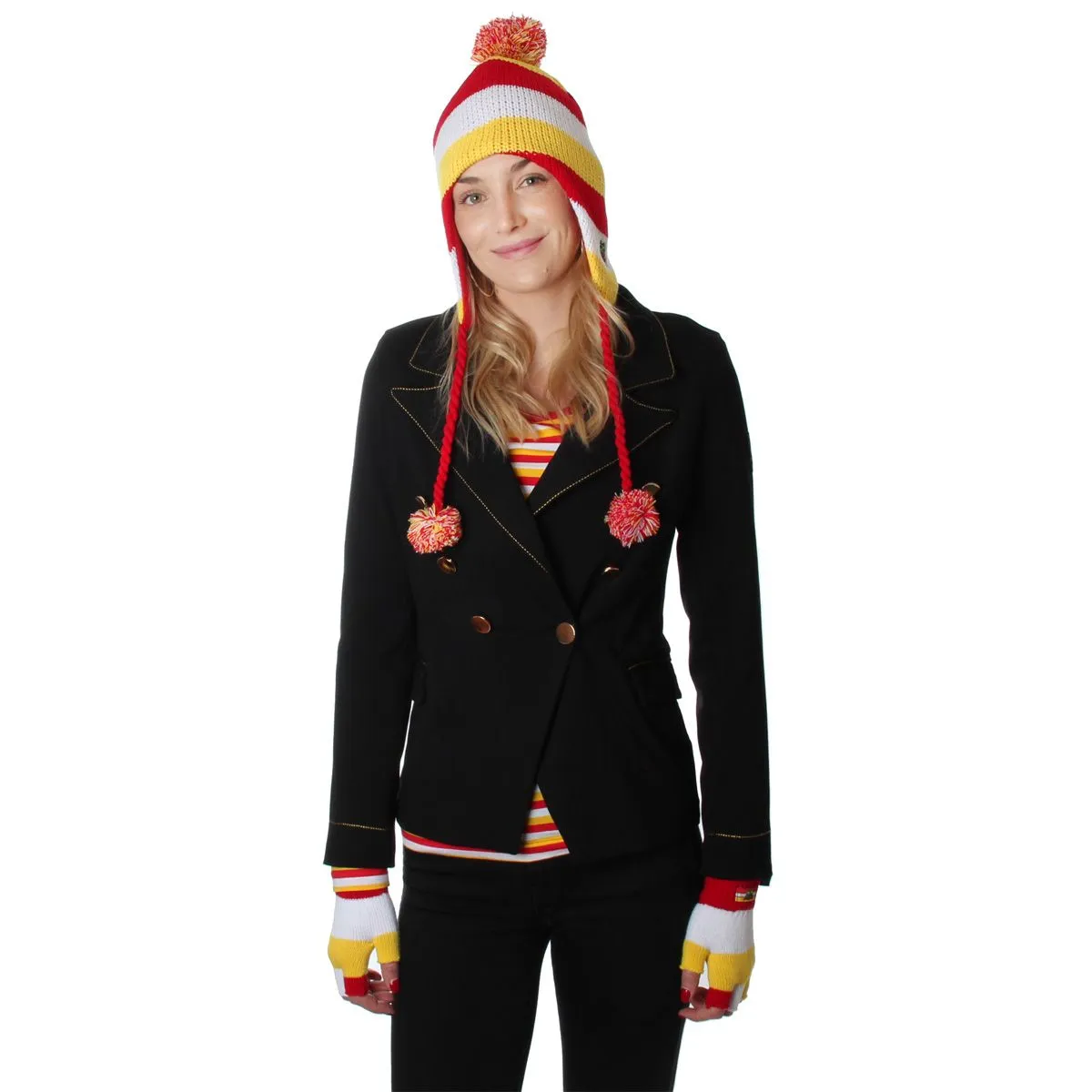 Mooie gevoerde damesblazer double-breasted in diepzwart van stretch katoen-polyester. Afgewerkt met gouden knopen en gouddraad. Een schitterende blazer met een mooie pasvorm voor carnaval of voor je dagelijkse outfit.