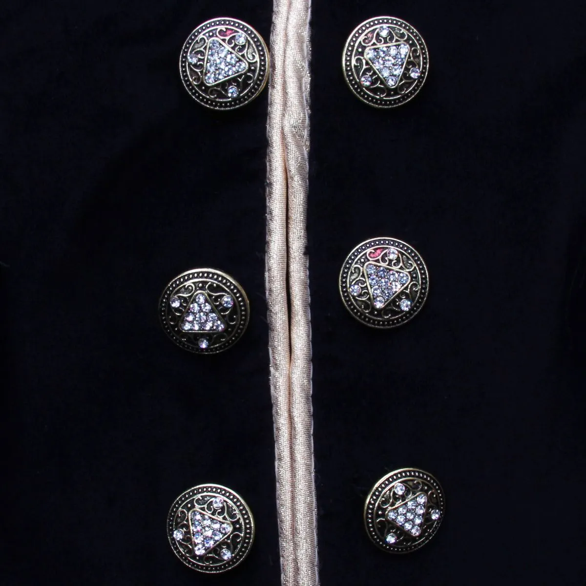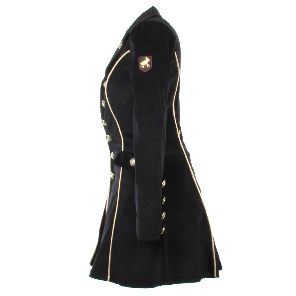 Prachtige damesjas van 100% zwart katoen-fluweel met strech. De jas heeft een mooie pasvorm. Gebiesd met goud koord en voorzien van luxe knopen. Deze Oeteldonk damesjas is getailleerd en valt iets klokkend. Qua lengte valt deze jas net boven de knie. Voorzien van een kraag en steekzakken. Deze jas kun je naar hartelust pimpen met kikkers, emblemen, band, strass, roosjes, speldjes etc. Je vindt het allemaal in onze webshop en winkel.
