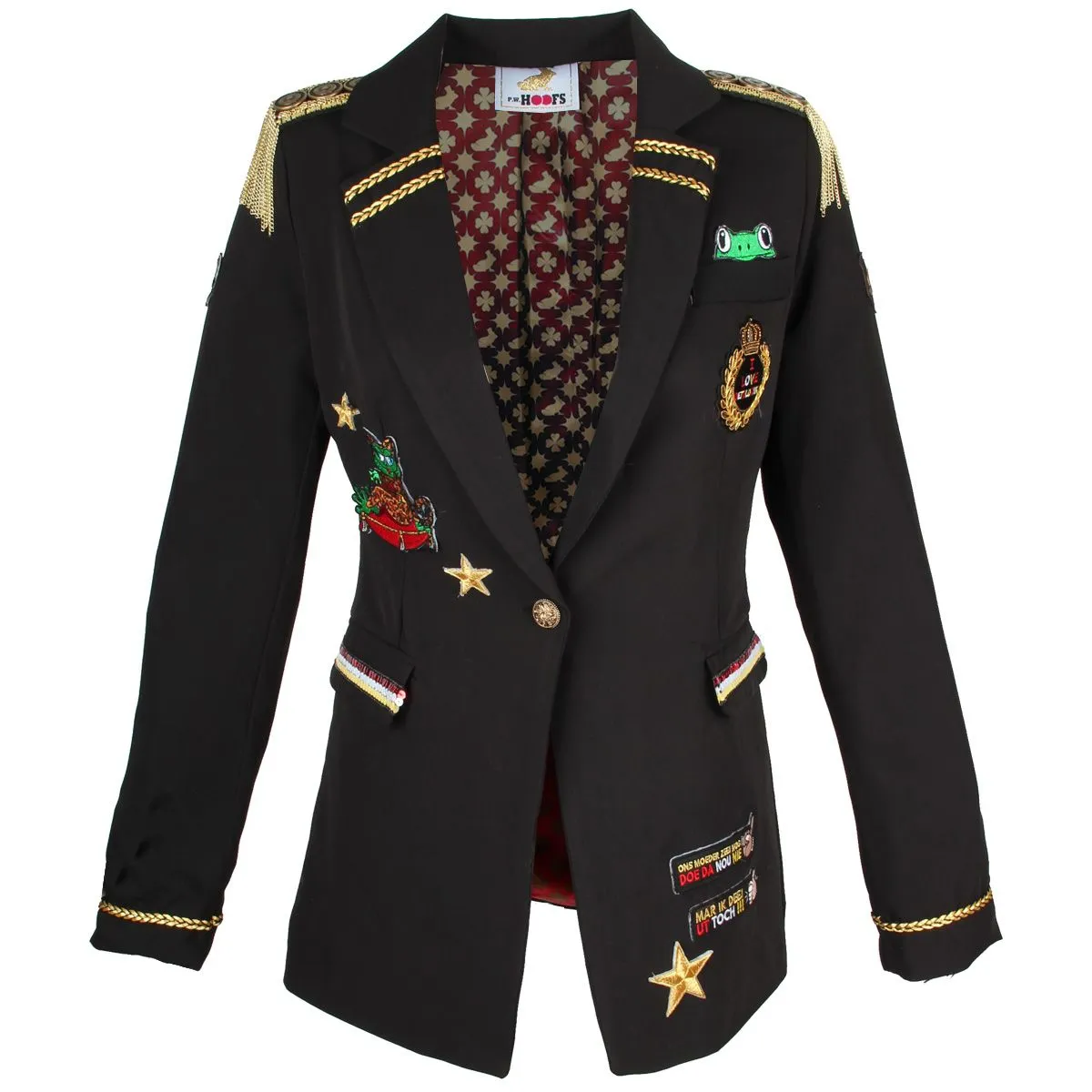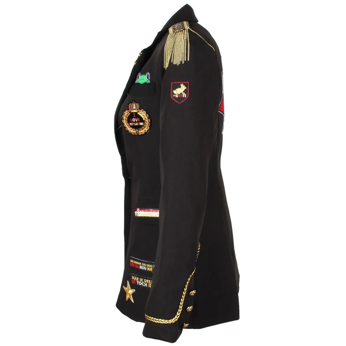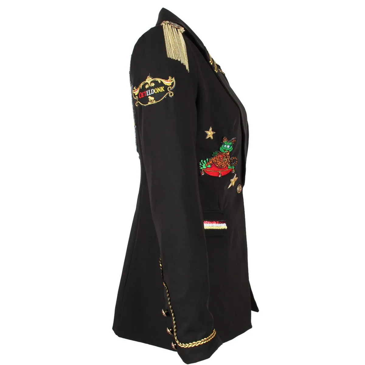 Exclusief bij Hoofs! Heel mooi passende, luxe, gevoerde Bossche damesjas van 100% polyester met een top draag comfort. Deze chique Oeteldonkse jas uit onze eigen productie heeft een prachtige diepzwarte kleur met gouden accenten. De jas is alvast voor gepimpt met diverse emblemen, een rugembleem, sierband en luxe epauletten. Zo ben jij helemaal klaar voor carnaval! Ook erg mooi te combineren met onze andere nieuwe emblemen en nieuwe exclusieve glitter broeken.