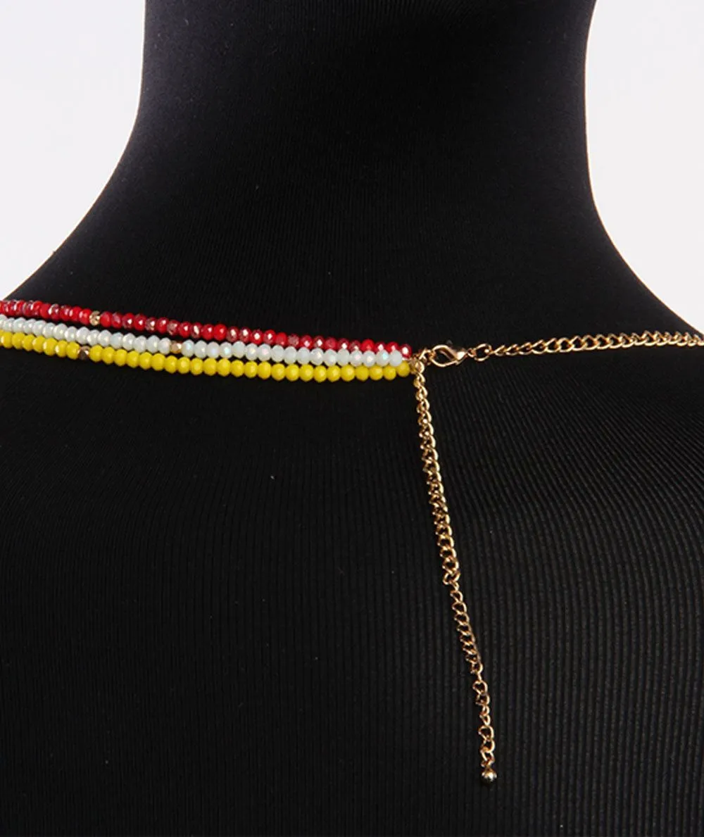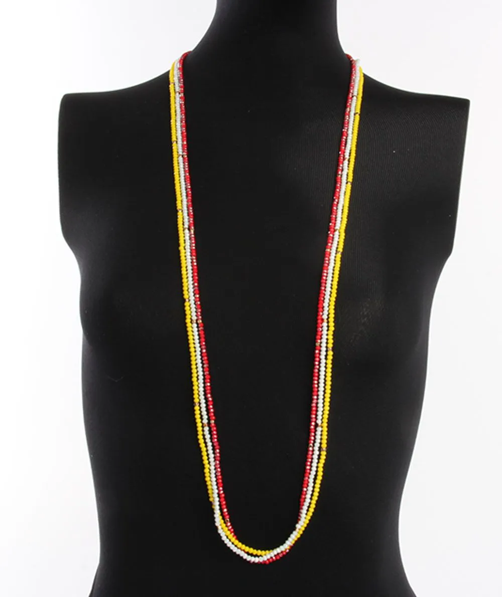 Lange Oeteldonk ketting in rood-wit-geel. De ketting heeft een goudkleurige verstelbare sluiting en bestaat uit drie verschillende banen.