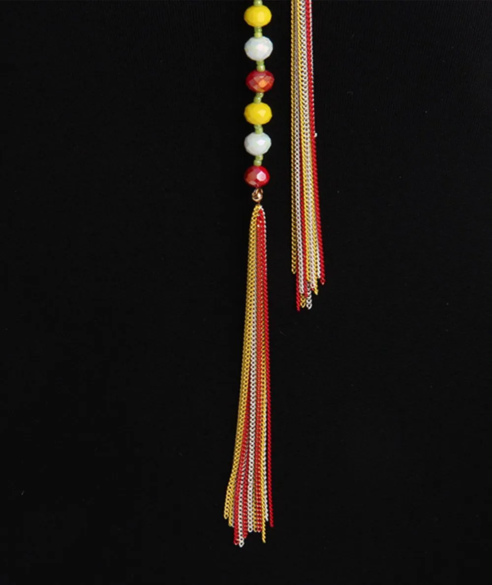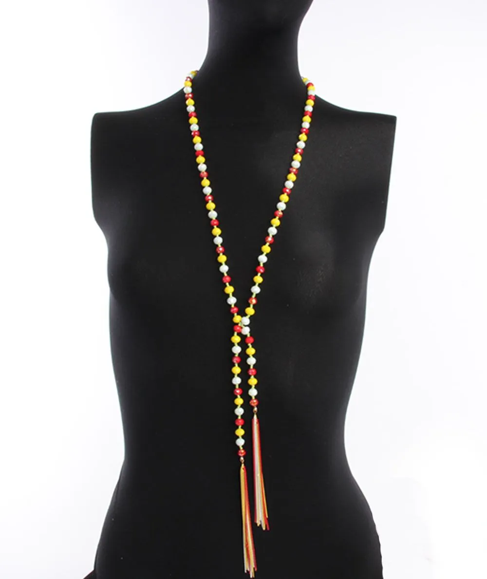 Oeteldonk ketting met kralen in rood-wit-gele kleur. De ketting heeft geen sluiting maar is geknoopt te dragen.