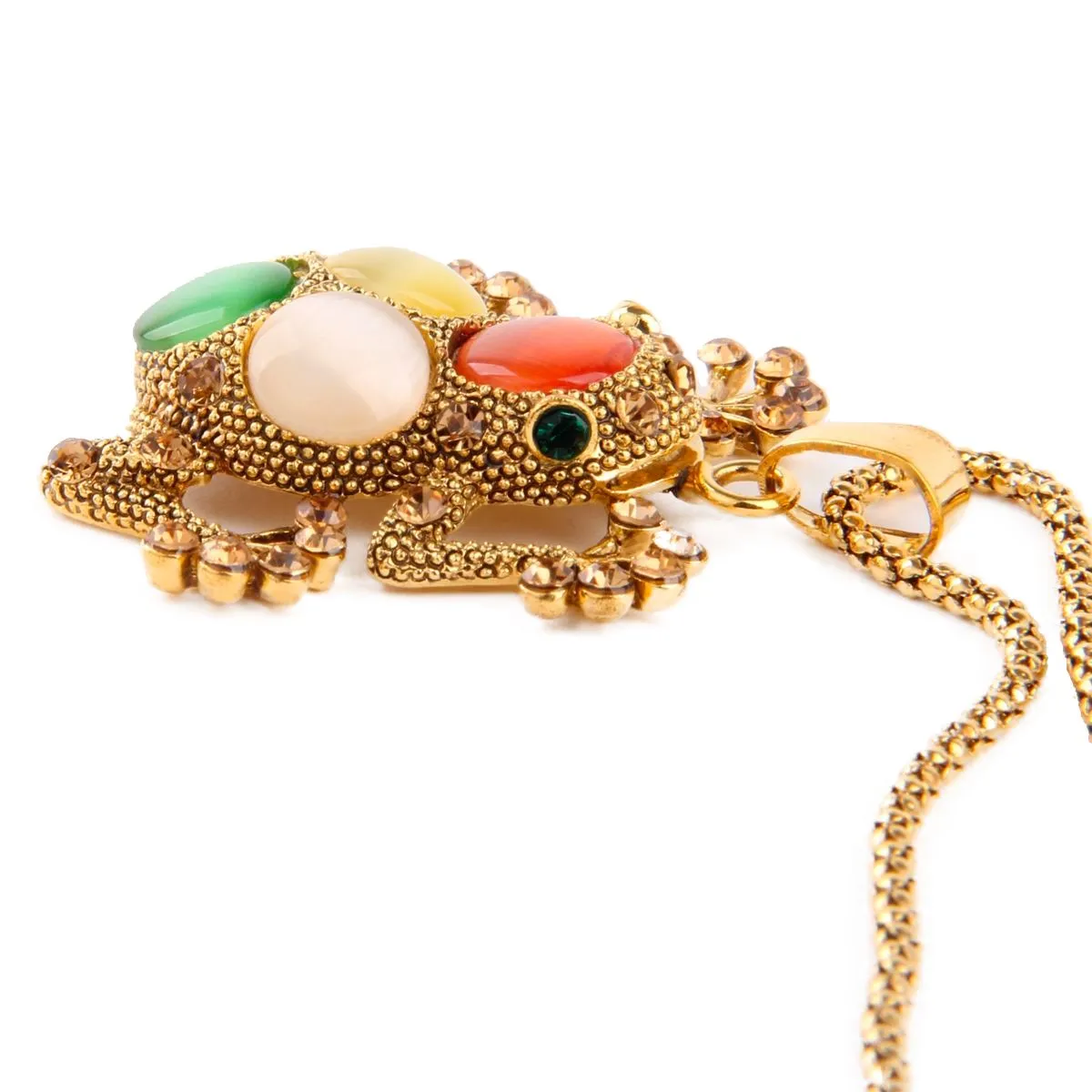 Wat een sierraad voor je hals! Deze gouden kikker, ingezet met rood wit gele steentjes, wil je nooit meer af doen. Een echte blikvanger!