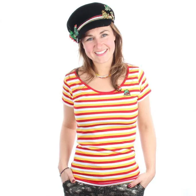 Oeteldonk shirt met korte mouwen voor dames. 100% katoen jersey. Zeer mooie kwaliteit, heldere kleuren. Met Oeteldonk kikker embleem, ronde aansluitende boord en boordje aan de mouw.
