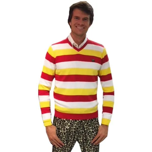Fijn gebreide trui van 100% katoen, mooie kwaliteit, met Oeteldonk embleem geborduurd. Aansluitende hals met v-hals, boord aan onderzijde en mouwen.