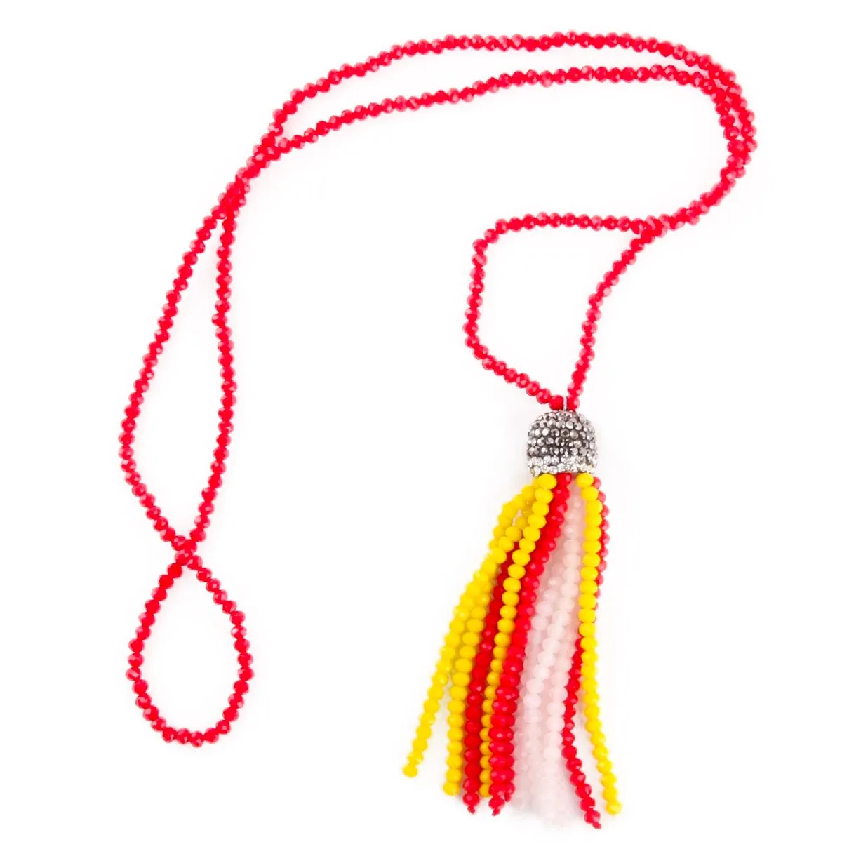 Leuke Oeteldonkse ketting in rood, wit en geel met zilvere strass steentjes.