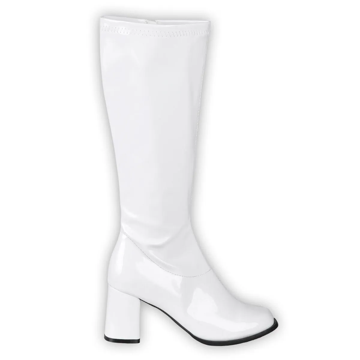 Witte dameslaarzen in hooglans lak. Met deze retro laarzen spat jij van de dansvloer af! Zeer geschikt voor je Disco, Hippie of Jaren 80 outfit.
